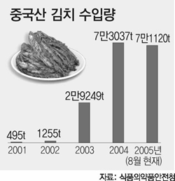 올해 들어 중국에서 수입된 김치는 모두 9만4551t으로 수입 가격은 4500만 달러(약 450억 원)에 이른다.