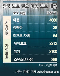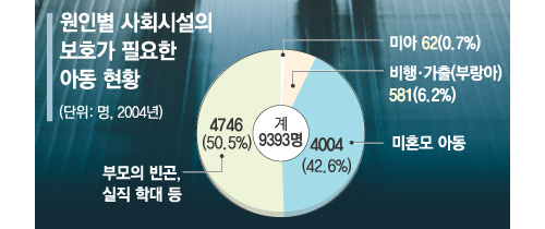 여성가족부 통계에 따르면 올해 들어 6월까지 각종 아동보호시설에 맡겨진 아이는 4706명. 이 가운데 부모의 실직과 이에 따른 빈곤, 부모 학대 등의 이유로 맡겨진 아이가 전체의 55%인 2608명이다. 또 미혼모가 아이를 낳고도 감당하지 못해 맡긴 경우가 1388명으로 29%다. 나머지는 아이들의 비행, 가출, 부랑 때문에 또는 길이나 집을 잃어 복지시설에 수용됐다.