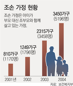 보건복지부 집계에 따르면 조손 가정은 농어촌 지역을 중심으로 2001년 810가구에서 지난해 3450가구로 4배 이상으로 늘었다.