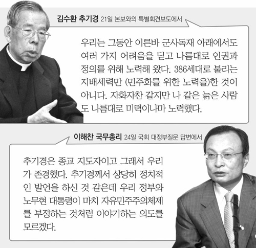 김수환 추기경이 국가의 정체성 문제에 대해 우려를 표명한 데 대해 이해찬 국무총리는 “종교지도자인 추기경이 상당히 정치적인 발언을 한것 같다”고 비판했다.