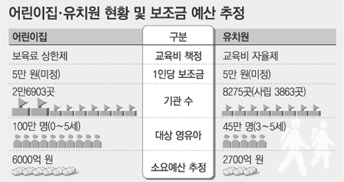 여성부는 어린이집에 다니는 0∼5세 영유아 1인당 월 5만 원 정도의 기본보조금 지급 방침을 정했다. 영유아 100만 명을 기준으로 소요 예산이 6000억 원으로 추정된다.