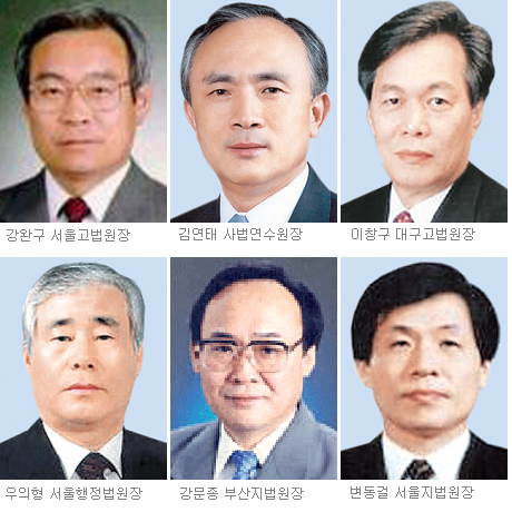 강완구(姜完求·사법시험 11회) 서울고법원장과 김연태(金然泰·사시 12회) 사법연수원장, 이창구(李昌求) 대구고법원장, 우의형(禹義亨) 서울행정법원장, 강문종(康文鍾·이상 사시 13회) 부산지법원장이 대법원에 사의를 표명한 것으로 26일 알려졌다.