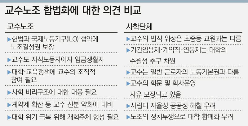 ▽사학단체 반대=한국대학법인연합회는 “교수는 학문의 자유가 보장돼 있고 학사운영 등에서 어떤 제한도 없는 만큼 일반근로자의 노동기본권과는 다르다”고 밝혔다.