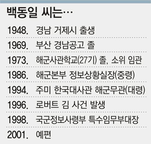 백 씨는 한때 해군의 최고 정보장교였다. 국방부는 해외 공관의 무관을 상대로 6개월마다 평가를 하는데 백 씨는 1995년에 두 차례나 최우수 무관에 선발됐다.