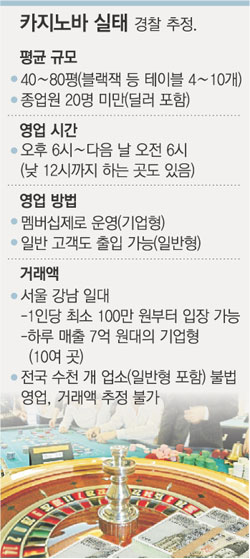 경찰에 따르면 서울 강남 일대에는 하루 매출 7억 원이 넘는 ‘기업형’ 업소가 10곳에 이르는 것으로 추정된다. 처음부터 100만 원어치의 칩을 바꾸어야 입장을 허용하는이들 업소의 하루 순익은 2억 원대.