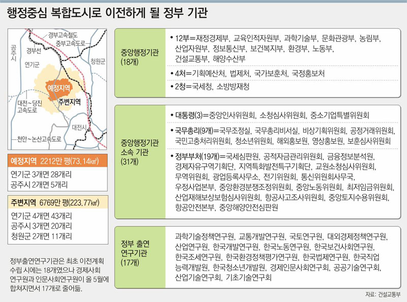 행정도시는 충남 연기군 남면 금남면 동면, 공주시 장기면 반포면 등 5개면 33개리 일대 2212만 평에 들어선다.