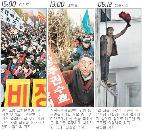민주노총은 이날 오후 3시 서울 영등포구 여의도 국민은행 앞에서 조합원 등 5000여 명이 모인 가운데 ‘총파업승리 결의대회’를 열고 비정규직의 정규직 전환을 위한 입법과 특수고용직의 노동 3권 쟁취, 농민시위 진압에 대한 사과 등을 정부에 촉구했다.