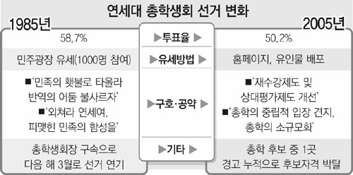 서울대 연세대 등 대학신문을 통해 1985년, 1995년 총학생회장 선거와 올해 선거의 달라진 풍속도를 살펴봤다.