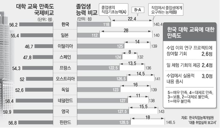 한국직업능력개발원(직능원)의 ‘대졸 취업실태 보고서’에 따르면 한국 대졸자의 직업기초능력과 기업이 요구하는 업무능력의 괴리도는 선진국에 비해 매우 컸다.