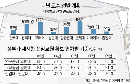 대학들은 내년부터 7년간 2조1000억 원이 투입되는 두뇌한국(BK)21 사업과 로스쿨에 선정되려면 교수 확보율이 높아야 유리할 것으로 판단하고 있다.