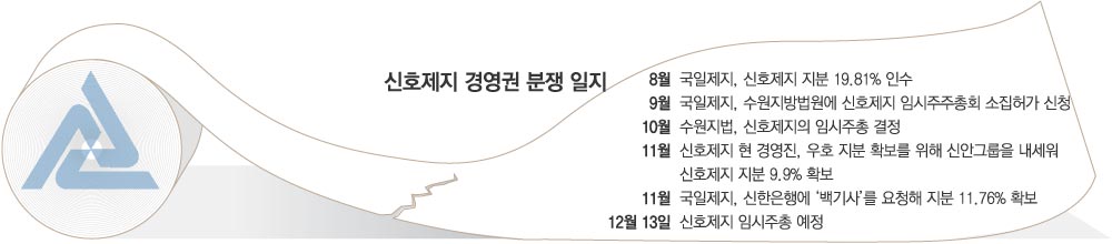 신호제지의 현 경영진은 우호지분 확보를 위해 신안그룹을 내세워 지난달 9.9%의 지분을 매입하도록 했고 국일제지는 신한은행에 협조를 요청해 지분 11.76%를 확보하도록 했다.