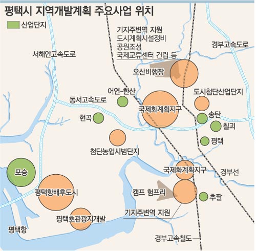 ▽기대 효과와 지역 반응=정부는 평택시 일대 지역의 국내총생산(GDP)이 매년 8.3%씩 초고속으로 성장해 2000년 현재 5조 원에서 2020년 25조 원으로 크게 증가할 것으로 기대하고 있다.