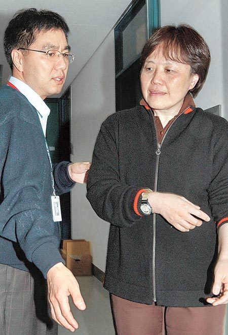 황우석 서울대 석좌교수 연구팀의 핵심 인물인 수의대 이병천 교수(왼쪽)와 의대 안규리 교수가 5일 황 교수 연구실 앞 복도에서 이야기를 하고 있다. 이들은 이날 수의대 강성근 교수 등과 MBC PD수첩팀의 취재로 벌어진 최근의 사태를 어떻게 봉합해 나갈지에 대해 회의를 열었다.