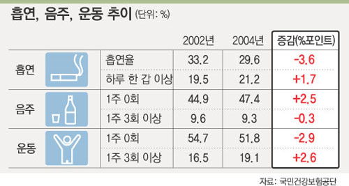 또 문진표를 분석한 결과 담배를 피우는 사람은 2002년 33.2%에서 지난해 29.6%로 줄어들었다. 그러나 하루에 한 갑 이상 담배를 피우는 이른바 ‘헤비 스모커’는 2002년 19.5%에서 지난해 21.2%로 오히려 늘었다. 담배를 피우는 사람은 줄었지만 흡연자의 흡연량은 늘어난 셈이다.