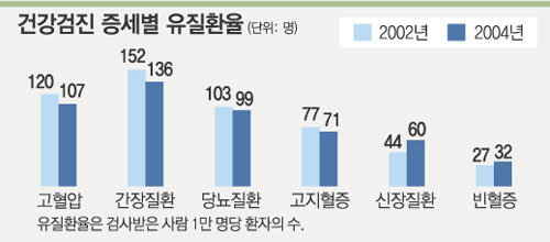 그러나 5년간 추이를 보면 고혈압, 간장 질환, 당뇨의 유질환율은 계속 줄어드는 반면 신장 질환 유질환율은 2000년 28명에서 지난해 60명으로 증가 추세다.