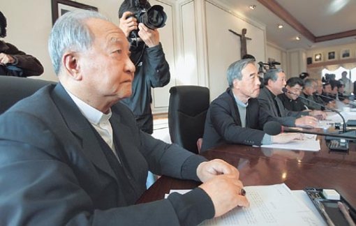 14일 서울 광진구 중곡동 천주교 주교회의 빌딩 회의실에서 열린 사립학교법 관련 대책회의에서 정진석 대주교와 강우일 주교(왼쪽부터) 등 참석자들이 심각한 표정으로 대응 방안을 논의하고 있다. 천주교는 이날 사학법 개정안에 대해 대통령이 거부권을 행사해 줄 것을 요청했다.