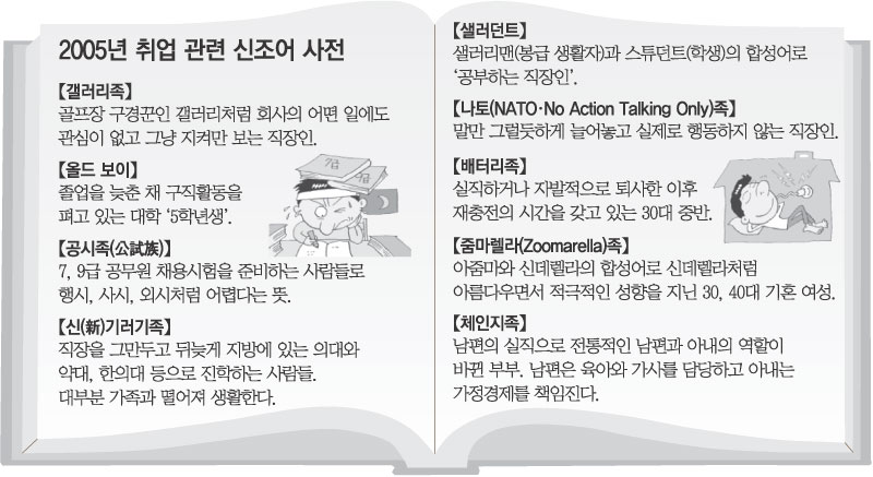 채용포털 커리어(www.career.co.kr)는 15일 올해 취업시장과 직장에서 새로 등장하거나 유행한 신조어(新造語)를 조사했다. 2005년은 세태를 반영한 갖가지 신조어가 유난히 많이 쏟아진 한 해였다.