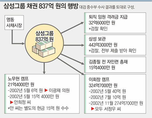 이 가운데 △한나라당 324억7000만 원 △노무현(盧武鉉) 캠프 21억 원 △김종필(金鍾泌) 전 자민련 총재 15억4000만 원 등 361억1000만 원이 정치권으로 흘러갔다. 32억6000만 원은 퇴직 임원 격려금과 개인 용도로 썼고, 나머지 443억3000만 원은 삼성그룹이 그대로 보유 중인 것으로 확인됐다.