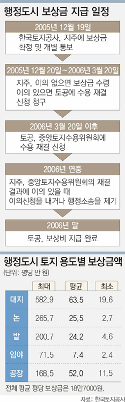 토공이 19일 공개한 행정도시 보상비는 모두 3조4106억 원. 이번 보상에서 제외된 분묘 1만5000기와 영업권 등에 대한 추가 보상을 포함해도 총 보상금은 4조 원 안팎이 될 것으로 보인다.