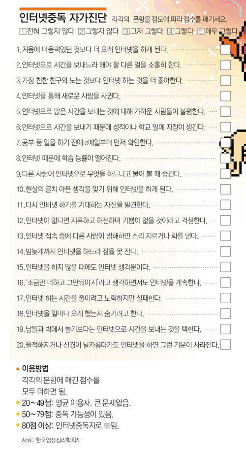 ▽사이트 정기 접속하면 빨간불=게임중독을 의학적으로 정의하자면 ‘병적 컴퓨터 사용 장애’라고 부를 수 있다. 일반적으로 남학생이 많다. 여학생은 게임보다는 채팅중독인 경우가 더 많다.