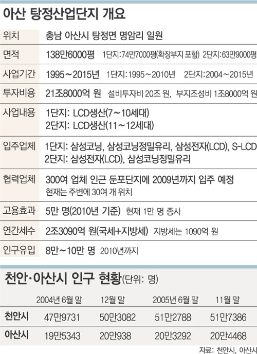 ▽향후 계획=충남도와 아산시는 탕정산업1·2단지에서 10km 정도 떨어진 아산시 둔포 지역에 75만 평 규모의 ‘둔포전자정보집적화단지’를 2008년 완공할 계획이다. 삼성 탕정산업단지의 성공을 위해선 우수한 협력업체의 도움이 필요하기 때문.
