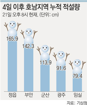 기상청은 21일 “이날 오후 11시 현재 최고 44.6cm의 폭설이 쏟아진 호남지역에 22일 최고 15cm가량의 눈이 더 내릴 것”이라며 호남 및 제주 산간지역에 대설경보를, 충남 서해안과 울릉도 독도 제주지역에 대설주의보를 내렸다.