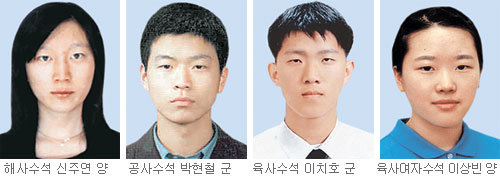 이날 합격자 230명(여성 23명 포함)을 발표한 육군사관학교에선 경기 군포시 흥진고 이치호(李治鎬·18) 군이 전체수석을, 대구 정화여고 이상빈(李相빈·19) 양이 여자수석을 차지했다.