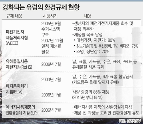 빠른 속도로 환경 규제를 강화하고 있는 EU는 올해 8월 전기전자제품의 수거시스템 구축을 의무화한 ‘폐전기전자제품처리지침(WEEE)’을 발효했다.
