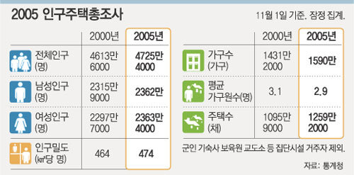 통계청이 27일 발표한 ‘인구주택 총조사 잠정 집계결과’에 따르면 11월 1일 현재 한국의 인구는 4725만4000명으로 2000년의 4613만6000명에 비해 2.4% 늘었다.