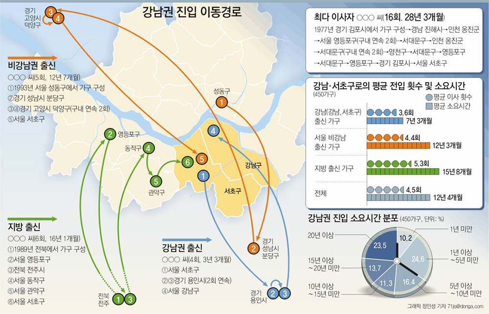 본보가 부두완(夫斗完) 서울시의원, 서울시, 강남 서초구와 공동으로 강남구 압구정1동 대치1·2동 도곡2동, 서초구 서초1·2·4동 반포2·3동 등 9개 동의 10, 11월 신규 전입자(450가구)를 조사한 결과 평균 12년 4개월 동안 4.5회 이사를 다닌 끝에 현 주거지에서 사는 것으로 나타났다.