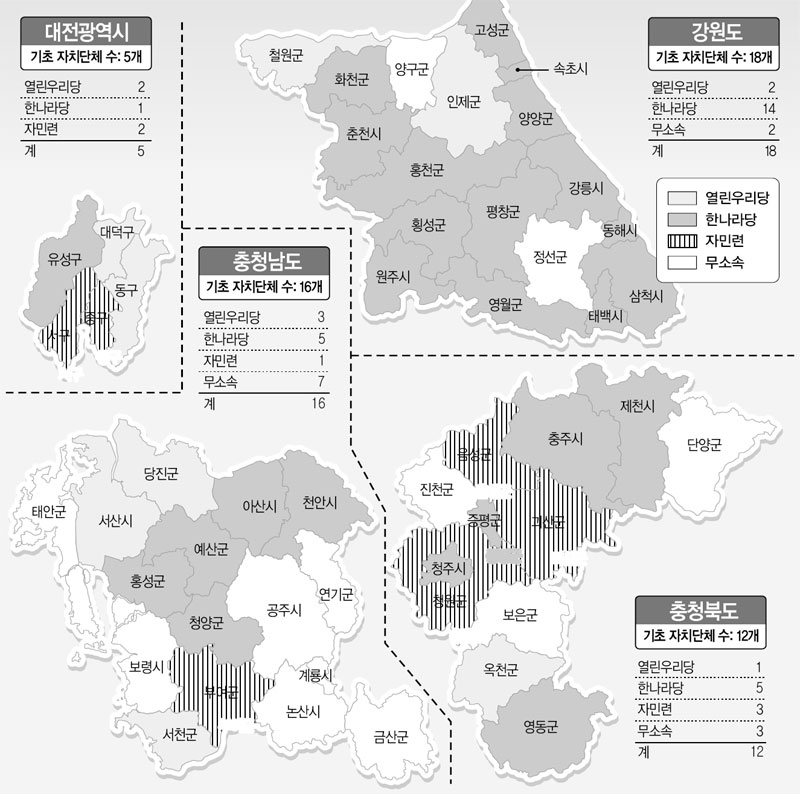 기초단체별로 정당지지도의 편차가 심하고 여론도 유동적이어서 기초단체장 후보 중에는 지금까지 정당 선택을 하지 못하고 고심하는 사람들이 적지 않다. 충북은 한나라당 상승 기류다. 한나라당은 6명의 현직 시장, 군수에 자민련 소속으로 당선됐던 일부 기초단체장들도 공천 보장을 전제로 입당을 타진하고 있다.