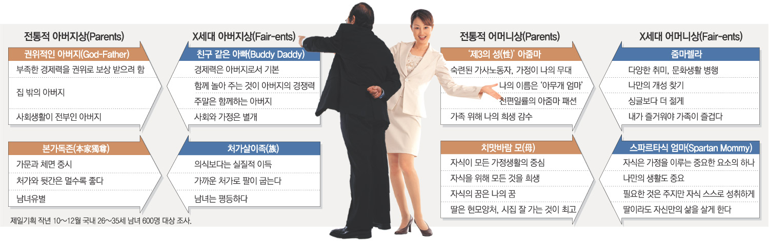 조사를 담당한 제일기획 박재항(朴在恒) 국장은 “X세대 부모들은 과거와 미래, 나와 남, 부부와 자녀 관계에서 한군데로 치우치지 않고 합리적으로 균형을 잡으려는 ‘공평한(Fair)’ 특성을 가지고 있다”며 “기존의 전통적 부모(Parents)와는 다른 ‘Fair-ents’라고 부를 수 있다”고 말했다.