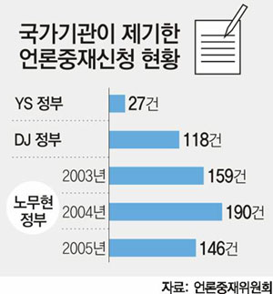 사설이나 칼럼에 대한 중재신청은 YS 정부 때는 없던 일이다. 하지만 DJ 정부에서 7건이 발생하더니 노무현 정부에선 2004년 7월까지만 해도 34건으로 크게 늘어났다.
