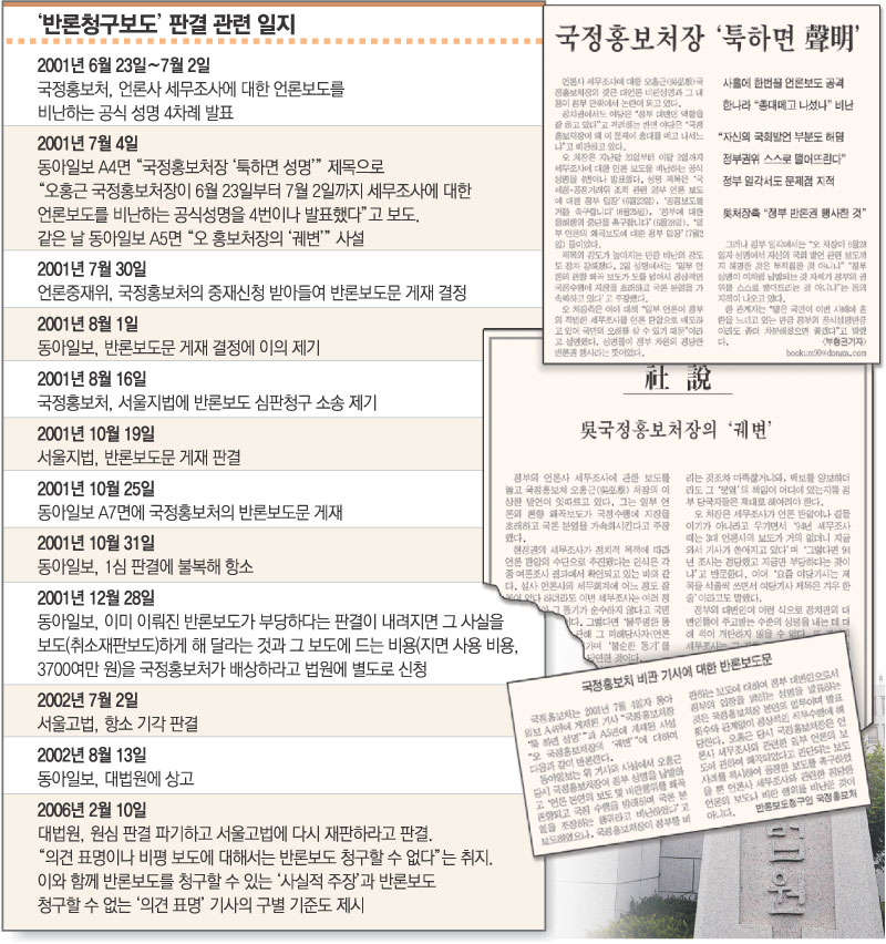 이번 대법원 파기환송 판결의 경우도 2001년 당시 국정홍보처가 ‘처장의 잦은 성명 발표’라는 본보의 사실 전달 기사뿐 아니라 그런 행태를 비판하는 사설까지 문제를 삼았던 것이다.