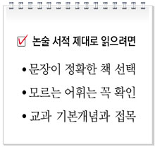 ▽책은 정독해야 한다=논술에서 고득점을 받으려면 분석적으로 독해하고, 깊이 있는 사고와 다양한 관점을 보여주면서 풍부한 근거를 제시해야 한다. 이런 채점 기준을 염두에 두고 최근 유행하는 논술 관련 서적을 읽어야 효과가 있다.