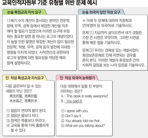 인성·적성 검사를 실시한 대학도 영어나 한문 등 외국어 능력을 측정하는 문제, 수학과 관련된 풀이문제, 맞춤법, 사자성어 등 단순 지식을 측정하는 선다형 문제를 낸 것으로 파악됐다.