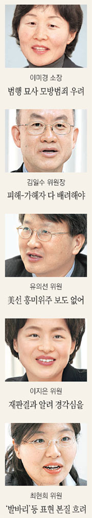 ▽김일수 위원장=두 가지 관점에서 볼 수 있겠습니다. 하나는 이력이나 가족 사항까지 들춰내 가해자의 인격을 과도하게 건드리는 점입니다. 고전적 의미의 인권 개념이지만 가해자 쪽에 대한 배려가 충분하지 않다고 봅니다. 또한 피해자 쪽의 2차적 피해에 대한 배려가 미흡합니다. 수사 및 재판과정에서의 끔찍한 상황 재연과 노출로 악몽을 반복해서 되살리게 만들고 주간지 등의 확대 보도는 너무나 가혹합니다.
