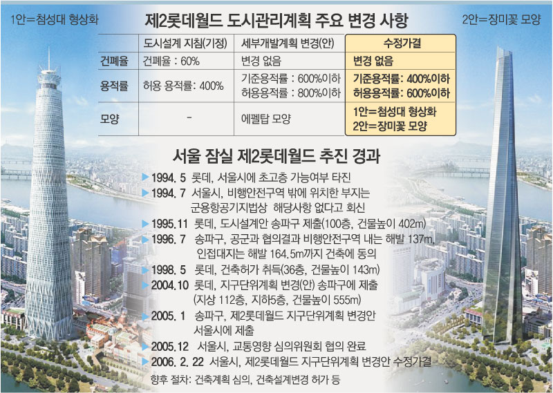 서울시는 22일 제4차 도시건축공동위원회 심의에서 제2롯데월드 특별계획구역 세부개발계획변경(안)을 수정 가결했다고 밝혔다. 도시건축공동위원회는 이날 회의에서 롯데가 제2롯데월드의 에펠탑 모양 대신 제시한 첨성대(국보 31호)와 장미꽃 모양의 2개의 조감도 모두 건축이 가능하다며 통과시켰다.