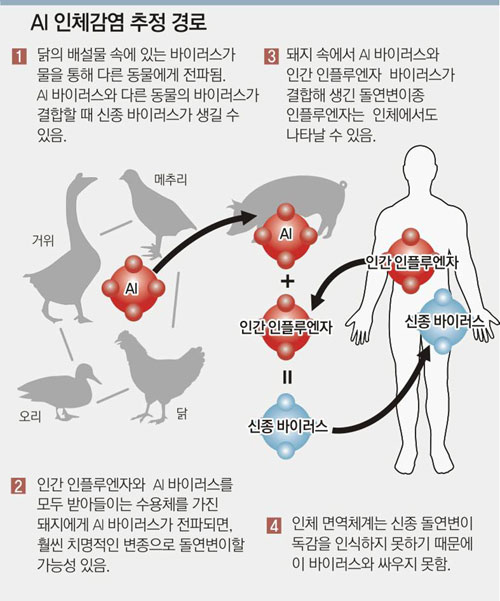 ▽첫 인체 감염 확인=질병관리본부는 국내에서 AI가 유행하던 2003년 12월부터 2004년 3월까지 닭 오리 등 가금류 도살처분에 참여했던 군인과 공무원 등 318명의 혈청으로 AI의 변종바이러스인 H5N1 항체검사를 실시한 결과 4명이 양성반응을 보였다고 24일 밝혔다. 질병관리본부는 지난해 11월 미국 질병통제예방센터(CDC)에 이들의 혈청을 보내 정밀검사를 의뢰한 결과를 최근 통보받았다.