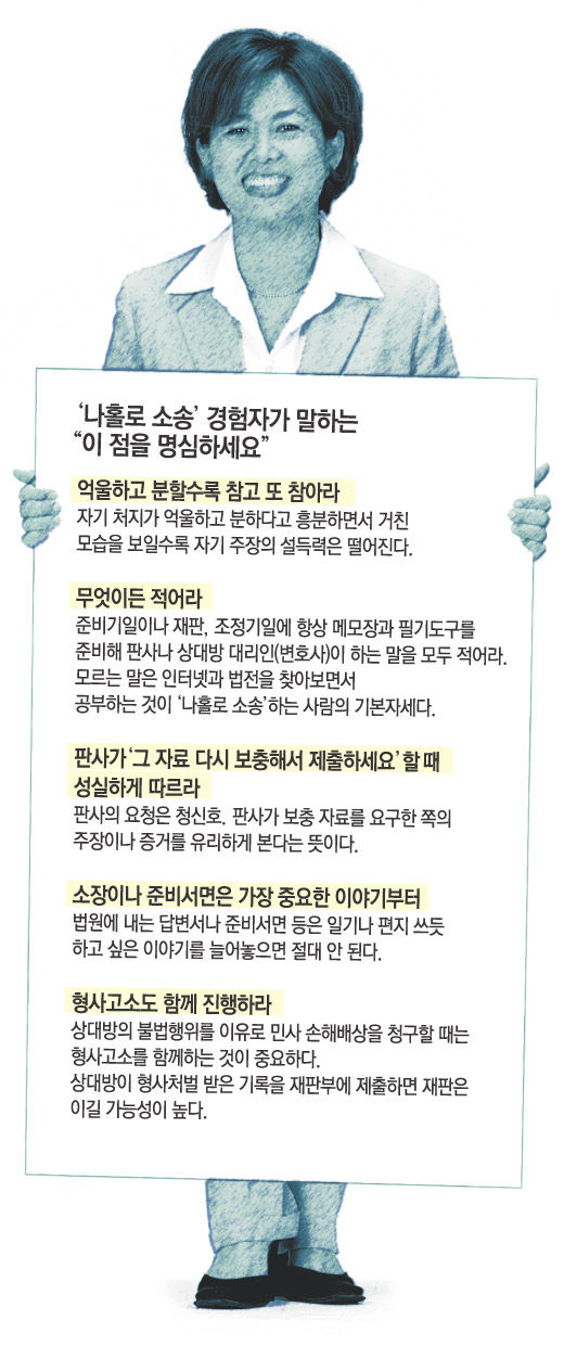 그러나 서울중앙지법의 한 판사는 “변호사를 못 믿어 나홀로 소송을 진행하는 심정은 이해할 수 있다”며 “그러나 소송에는 전문적인 법률 문제가 많기 때문에 변호사를 잘 골라서 맡기는 게 좋다”고 말했다.