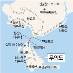인천공항의 야경이 한눈에 펼쳐지는 무의아일랜드패밀리펜션(032-752-5114)에서 하룻밤을 묵어도 좋을 듯하다. 서울에서는 인천국제공항고속도로를 이용하면 된다. 인천국제공항고속도로 신불도나들목 남측 방조제를 건너 좌회전하면 무의도로 가는 잠진도 포구가 나온다. 배가 30분 간격으로 뜬다. 이 배에 자동차를 실을 수 있다. 잠진도 나루터 032-751-3355