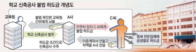 문제는 그동안 공사를 따낸 업체가 무면허 건설업자에게 불법 하도급을 주면서 차액을 챙기는 데 있다. 이렇게 만든 비자금은 공사를 발주한 교육청 간부에게 전달된다.