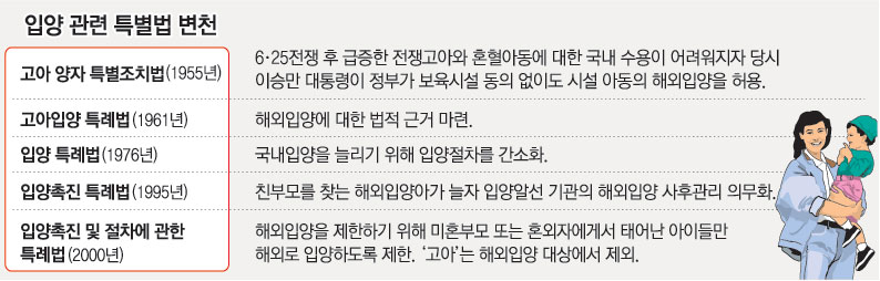 최초의 입양관련 특별법은 1955년 대통령령으로 선포된 ‘고아 양자 특별조치법’이다. 6·25전쟁으로 급증한 전쟁고아와 혼혈아동에 대한 국내 수용이 어려워지자 당시 이승만(李承晩) 대통령은 정부가 보육시설 동의 없이도 시설 아동의 해외입양을 허용했다. 이후 매년 수천 명의 고아가 미국 유럽 등지로 입양됐다.