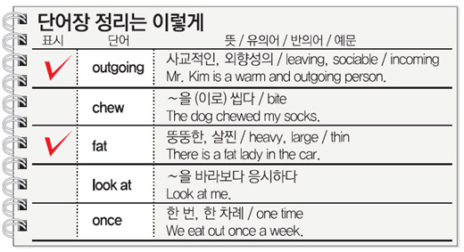 본격적인 단어 암기를 위해 반드시 단어장을 작성해야 한다. 단어와 의미뿐 아니라 파생어와 예문도 함께 정리하도록 한다. 반복할 때마다 암기 여부를 체크할 수 있는 공간을 비워두는 것이 좋다. 단어 찾기는 종이사전을 활용하는 것이 효과적이다.