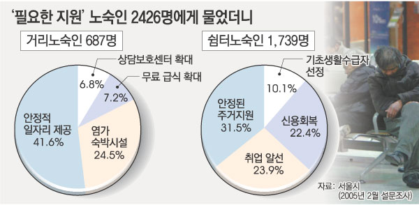 하지만 지난해 2월 서울 시내 노숙인 2426명을 상대로 한 설문조사 결과는 일자리 제공의 필요성을 단적으로 보여 준다. ‘자활을 위해서는 어떤 지원이 필요한가’라는 설문에 응한 거리노숙인 687명 가운데 41.6%가 ‘안정적인 일자리 제공’을 첫손에 꼽았고, 쉼터노숙인 1739명 중 23.9%가 취업 알선을 희망했다.