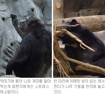 ▽여기는 ‘노(no) 스트레스’ 공간=이날 찾은 서울대공원은 동물 우리 곳곳이 리모델링돼 있었다. 단조로운 동물원 환경을 각각의 동물에 맞는 공간으로 만들어 주자는 취지다.