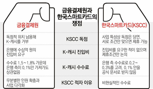 ▽수수료 인상, 또 다른 불씨=금융결제원은 “KSCC가 약속과 달리 거액의 진입비를 요구하고 있다”고 주장하고 있다.