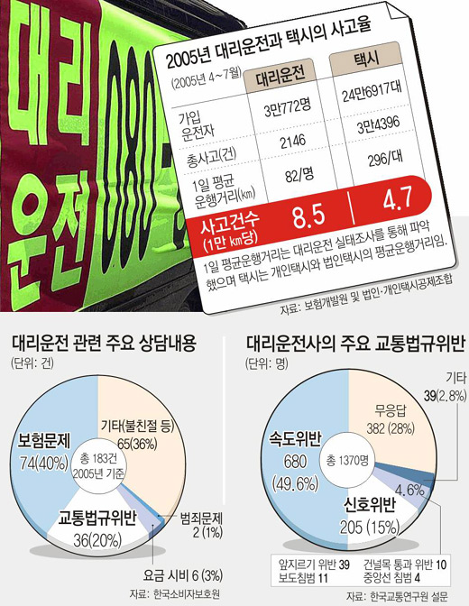 국무조정실과 건설교통부, 경찰청, 금융감독원이 한국교통연구원에 의뢰해 10일 국회 건설교통위원회 이낙연(李洛淵·민주) 의원에게 제출한 ‘승용차 대리운전 실태분석과 개선방안’ 보고서에 따르면 대리운전과 관련한 각종 사고가 잇따르고 있음에도 이에 대한 대책이 마련되지 않아 시민들이 큰 피해를 보고 있는 것으로 나타났다.