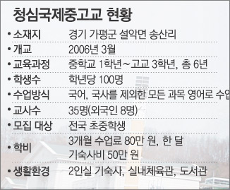 2일 경기 가평군 설악면 송산리에 문을 연 청심국제중고교가 신입생 모집부터 학부모들의 관심을 끌었다. 모든 수업을 영어로 진행하는 데다 교사와 시설이 최고 수준이라는 점이 알려지면서 지난해 11월 신입생 경쟁률이 21 대 1을 기록했다.