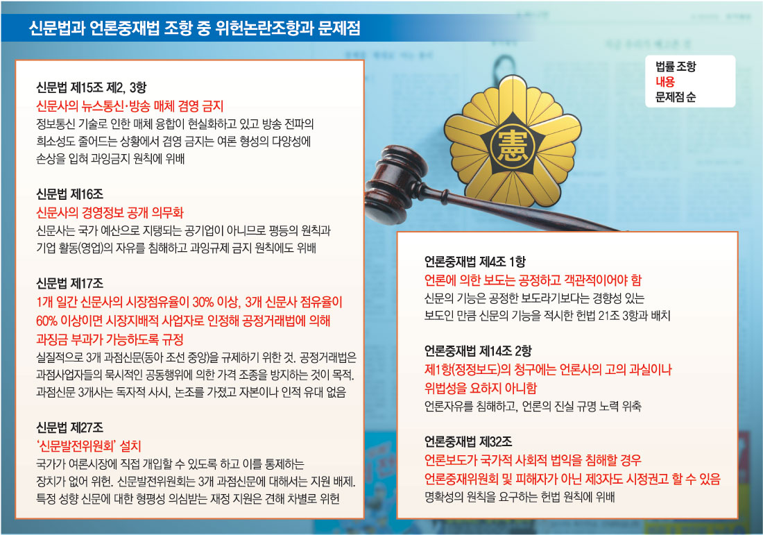 동아일보사 등은 당시 신문사의 시장점유율을 제한한 신문법 제17조 등 4개 조항과 언론중재법 조항들에 대해 “부당한 공권력의 행사로 헌법이 보장하고 있는 언론·출판의 자유(제21조 1항)와 직업의 자유(제15조), 경제적 자유(제119조 1항) 등을 침해하고 있다”고 주장했다.